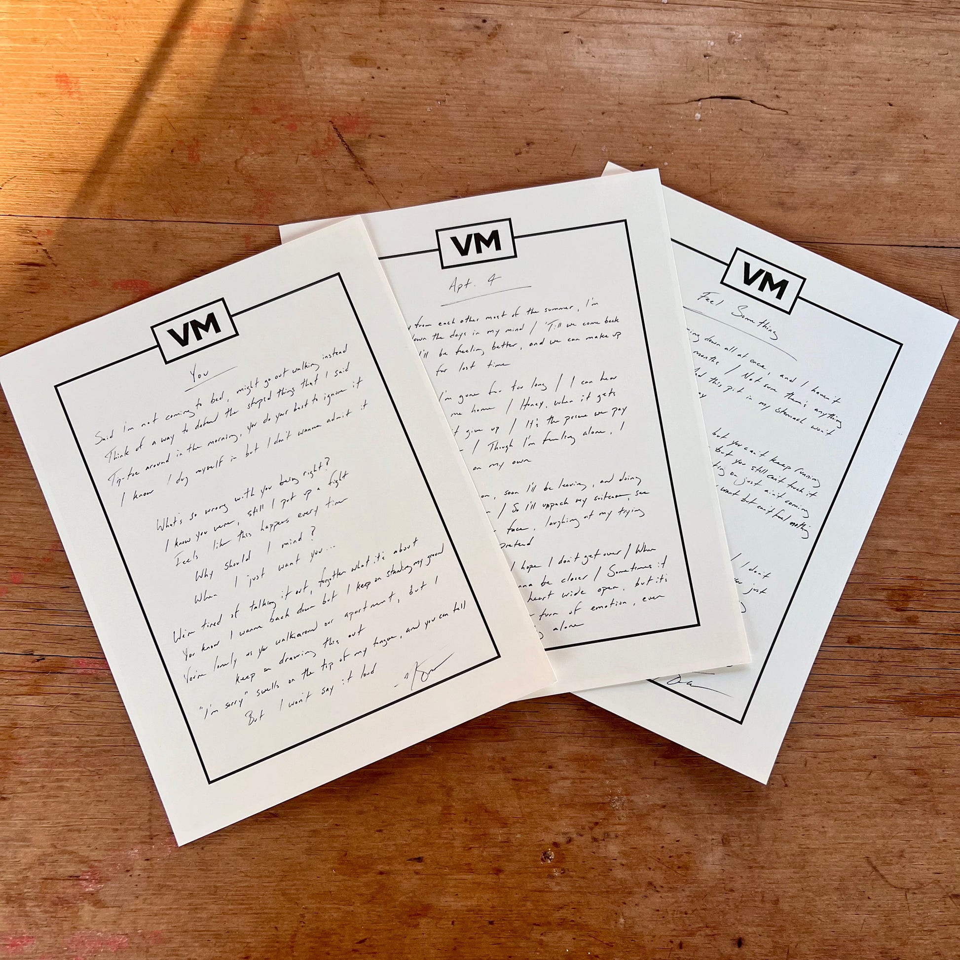 Handwritten lyrics of a Vacation Manor song of your choice, written on 8.5x11 cardstock paper. Each of these are made to order and handwritten from Nathan Towles.