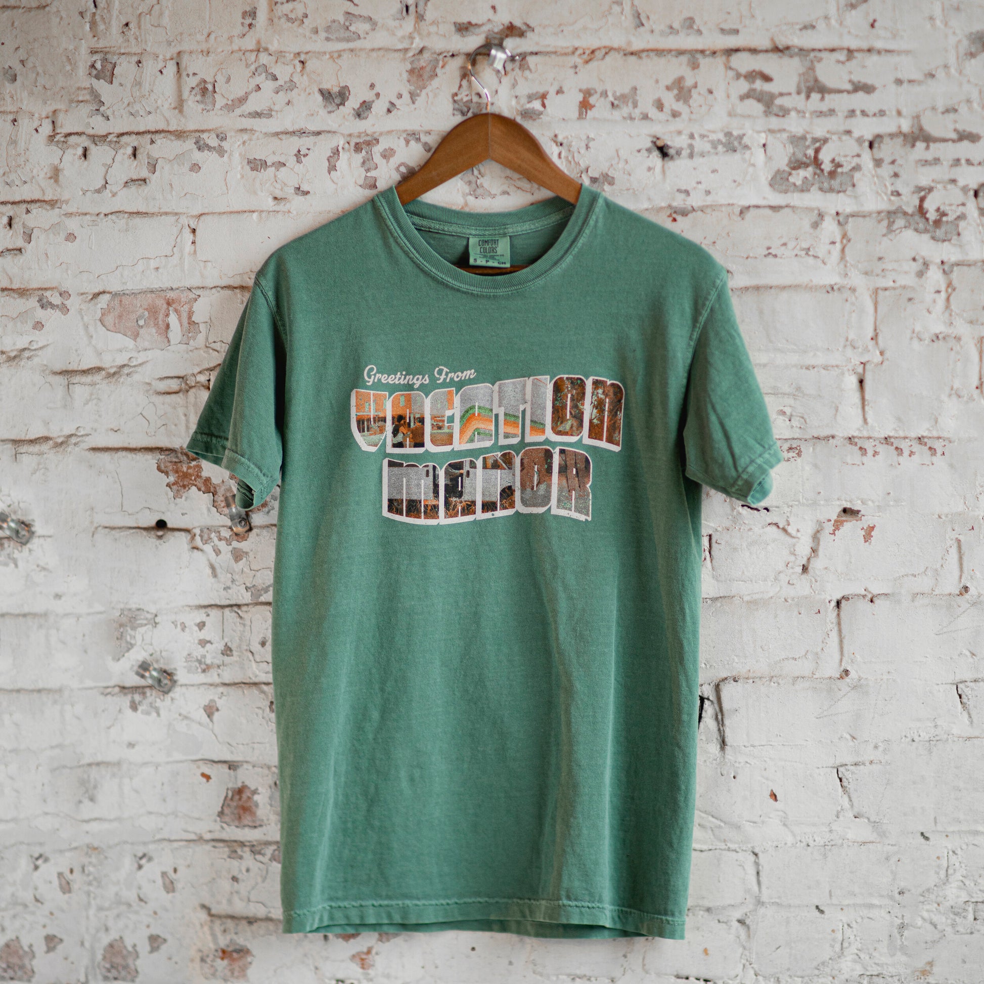 Greetings from Vacation Manor Postcard Tee - Printed on Comfort Colors Heavyweight Tee, Green.